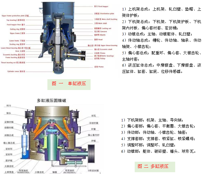 | 结构组成 | 上机架,下机架,动锥,传动轴,偏心套,液压缸体 | 下机架,偏心套,传动,支撑套,调整环,动锥 | 附图一、图二 |